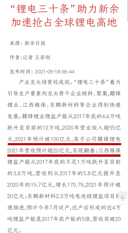 根据新余市官方转载的一篇报道,赣锋的电池业务,2021年营收预计超过20亿,那同比去年的增速就大概在58%,对比亿纬锂能23倍的市销率,赣锋的锂电池业务估值就将超过400亿。