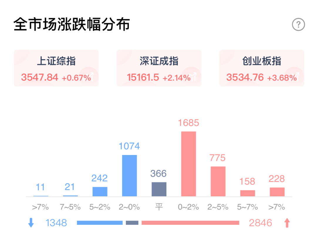 市场今天受到降准消息的影响,全天表现比较强势,各大指数都收了根中阳线,特别是创业板指大涨3.6%,这个上涨还是很猛的啊!