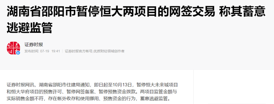 晚上又出来一个消息,湖南省邵阳市暂停恒大两项目的网签交易,称其蓄意逃避监管。屋漏又逢连夜雨,大伙可以备好瓜子搬出小板凳,看看许老板这回还能不能扼住命运的咽喉。