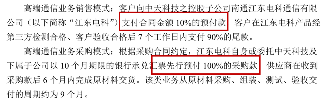这个人玩了个巧妙的财务游戏,你细看就会发现一个巧合的地方,这些爆雷公司描述商业模式都有同一句话,就是下游会先支付10%的预付款给上市公司,在中天科技的公告里,更加详细的描述了这种模式,下游预付10%的款项给上市公司,上市公司则要预付100%的采购款给上游公司: