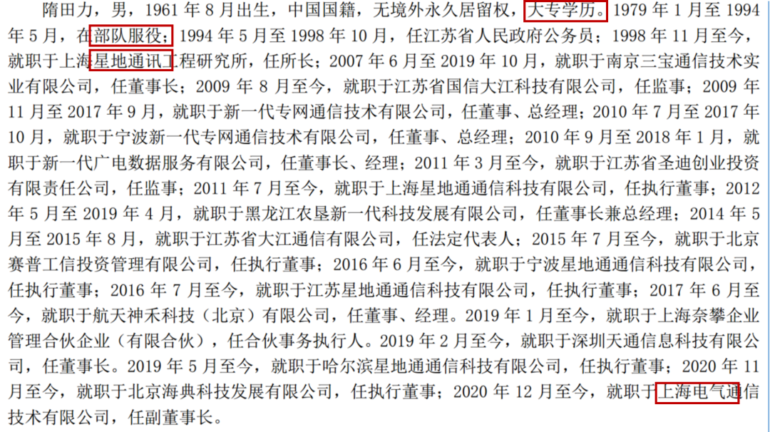 我们用隋田力在上市公司股东里搜索,发现他居然是新三板上市公司海高通信的实控人,在公司的年报里,对他有十分详尽的介绍: