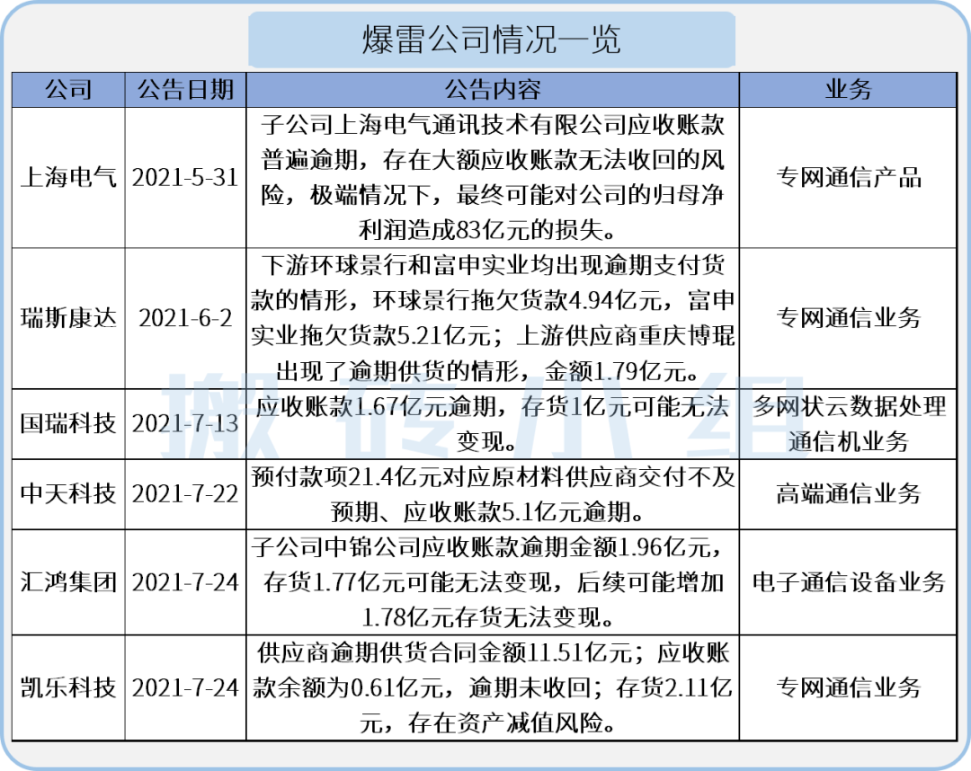 从这个公告统计里,可以发现几个共同点,这些公司面临的问题都是预付出问题,应收账款又逾期,业务领域都是通信,有三家公司的业务连名字都是一样的——专网通信业务。