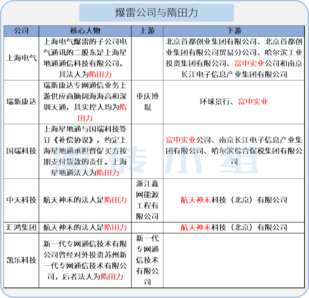 国瑞科技在起诉下游违约的时候,披露了上海星地通也需要承担部分责任;瑞斯康达公告里披露,其专网通信业务上游供应商——上海海高和深圳天通,其实控人均为隋田力;凯乐科技逾期供货的供应商——新一代专网通信技术有限公司曾经对外投资苏州新一代专网通信技术有限公司,后者法人为隋田力。