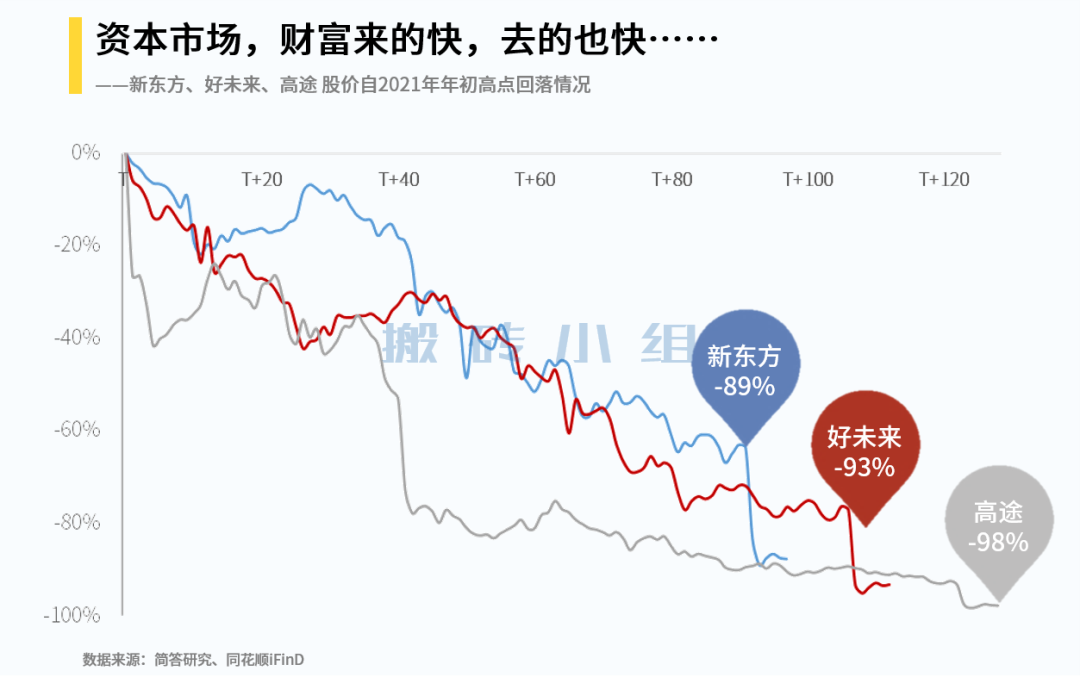 看看新东方、好未来、高途的股价走势,资本市场里,财富来的快,去的也快……
