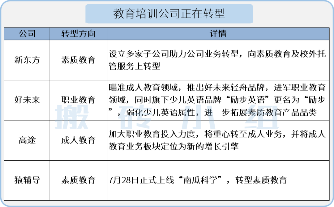 现在不少教培公司都在规划着转型,高途创始人陈向东表示,高途账上现金还能撑3到5年,这可能是留给上市公司转型的窗口时间,转型的方向主要是文件影响相对较小的素质教育、职业教育等。
