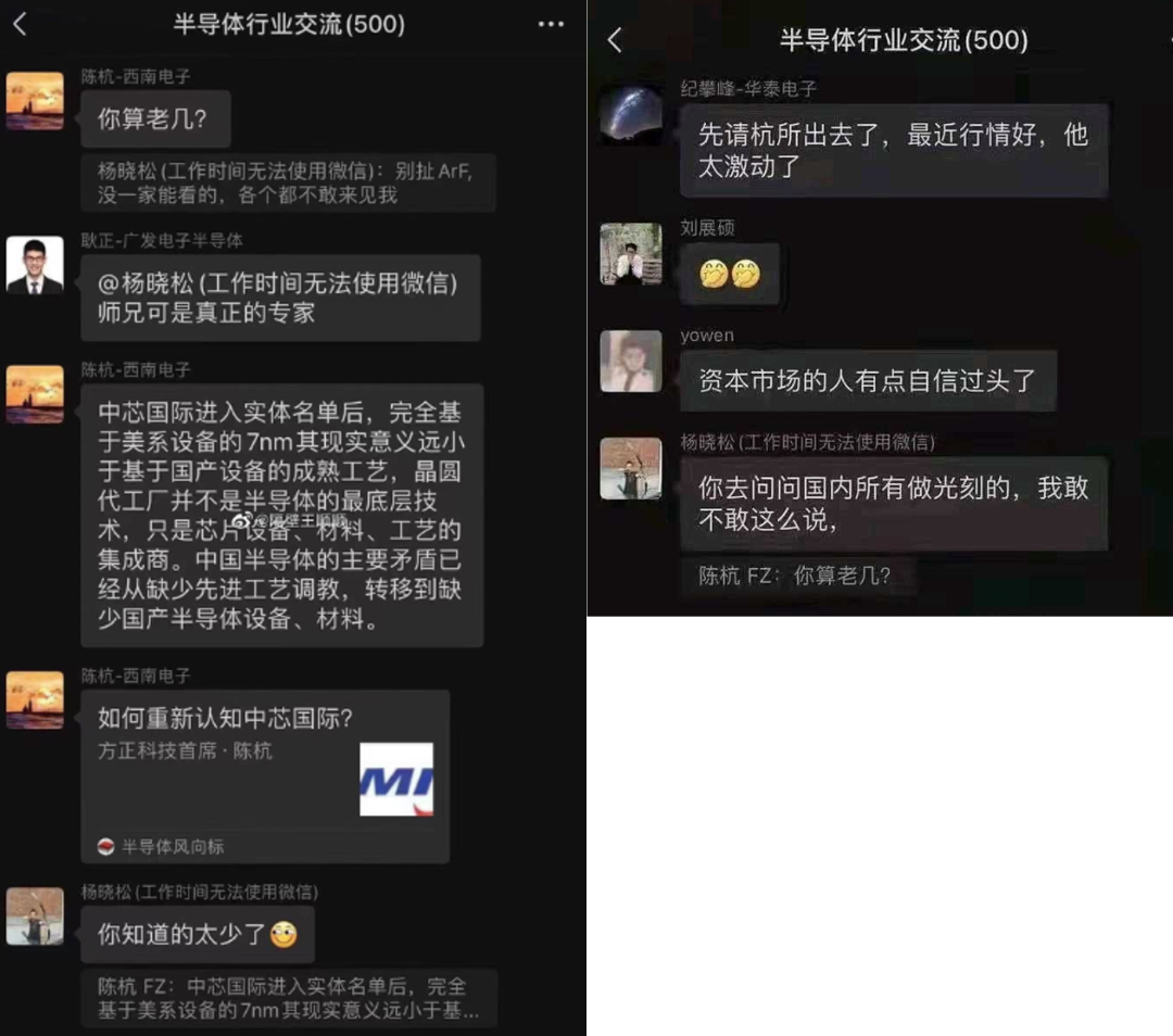 二是某券商电子首席分析师怒怼中芯国际光刻胶负责人杨晓松“你算老几”,起因是杨晓松发表对光刻胶的看法“别扯ArF,没一家能看的,各个都不敢来见我”,随后有人出来说“先请杭所出去了,最近行情好,他太激动”。
