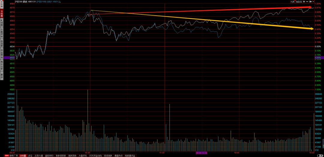 今天指数大涨,结构性行情演绎得非常极致,抓住结构真的就能赚大钱。看指数日内层面,今天有个不太好的信号,期货和期权的参与者从10点半后态度是偏空的,指数层面上的大机会还没看到。