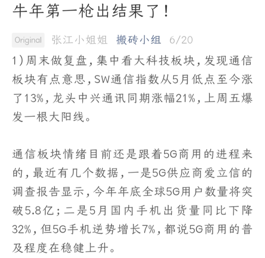 我们六月份关注到5G通信,通信板块在科技里面估值相对较低,5G设备龙头中兴通讯股价有异动。通信行业后面的采购招标超预期,中兴通讯上半年业绩预告超预期,股价有不错的涨幅。