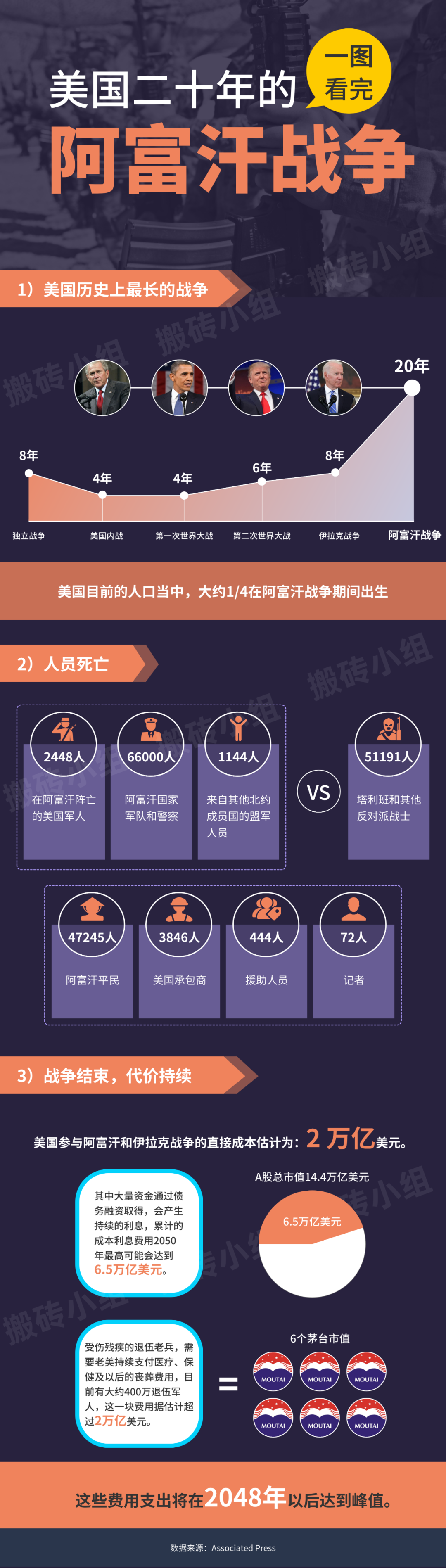 先看人员伤亡,在阿富汗参战的几方,美军阵亡2448人,老美的盟军阵亡1144人,阿富汗政府军阵亡66000人,对面的塔利班一派阵亡51191人。其他被溅射到的还有4万多平民,444名援助人员和72位战地记者以及3846名美国的承包商。每一个数字背后都是一个个像你我一样活生生的人……