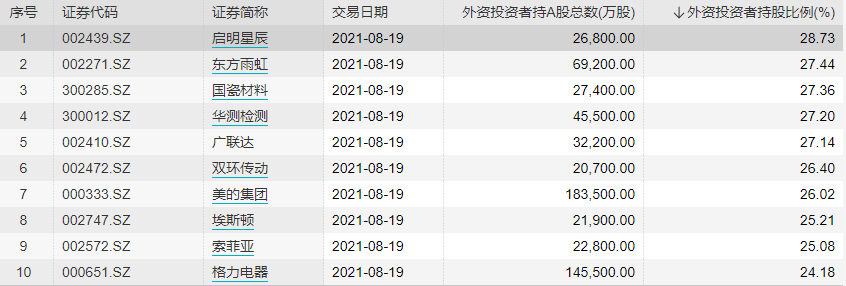 给大伙补个课,A股的外资持股比例有三档,分别是24%的预警、28%的暂停买入、30%的强制减持。现在东方雨虹的比例已经差不多27.5%,一般在第二档附近就会被剔除指数。目前还有部分公司超过了预警档,下图是最新的数据。