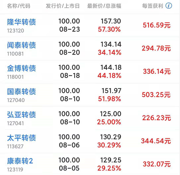 3、昨天上市的可转债暴涨57%,腱子肉秒变海底捞。我发现最近的转债肉都比较肥,好几个都在盘中涨到熔断,上市表现很多都超出以往的评级标准。下图是近期的新债首日表现,确实很顶,感觉转债又一轮的盈利周期来了,大伙要记得积极申购。