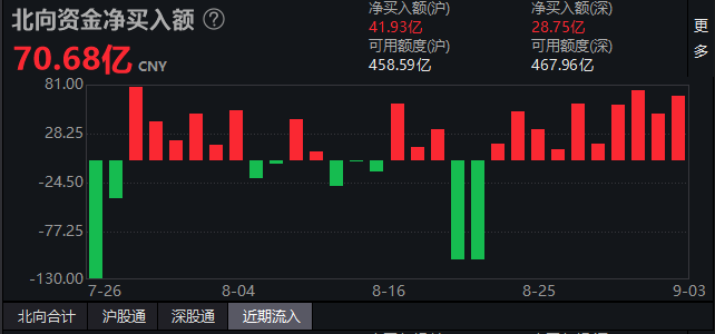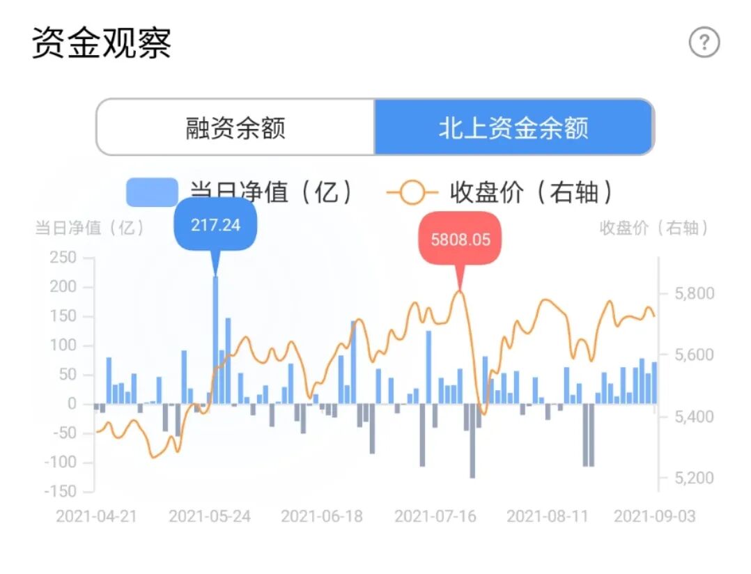 北上资金今天继续流入了70亿,北上连续流入10天,这里的态度是非常明确的。北上这段的流入跟上证指数的走势保持一致,这是个比较有意思的信号。