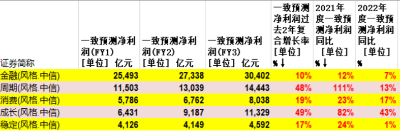 另外有个数据可以看下,市场五大风格板块的盈利预测,在明年会出现整体的下滑。其中周期股的增速在高基数作用下将从111%骤降至13%,成长板块的增速也将回归常态。