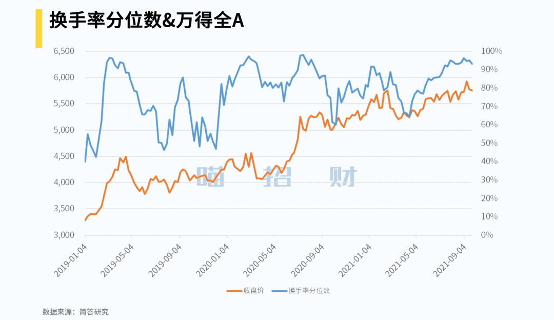 前两天跟大伙儿聊了下行业拥挤度,昨天最后留了个悬念,今天把最后这个也说了吧。这个指标是全市场换手率分位数,描述的是市场的热度情况。