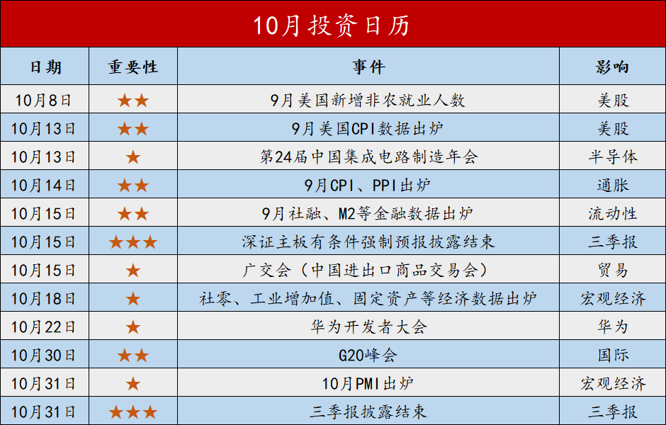 今天是节前最后一个交易日了,随后市场将开启漫长的休息,先是1号到7号的国庆休市,随后8号复盘一天,又将迎来2天的周末休市。估计假期大伙的心都会飞离资本市场,所以我提前把十月的一些重要事件整理了一下,帮大伙先预习一波。