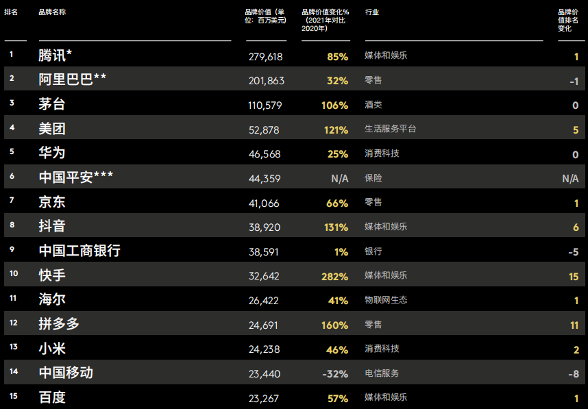 这次的榜单,腾讯凭借2800亿美元的品牌价值登顶,力压去年的冠军阿里巴巴。前十五名中,增速最高的是快手、拼多多和抖音这些新经济的代表,而移动、工行等传统方向表现一般。