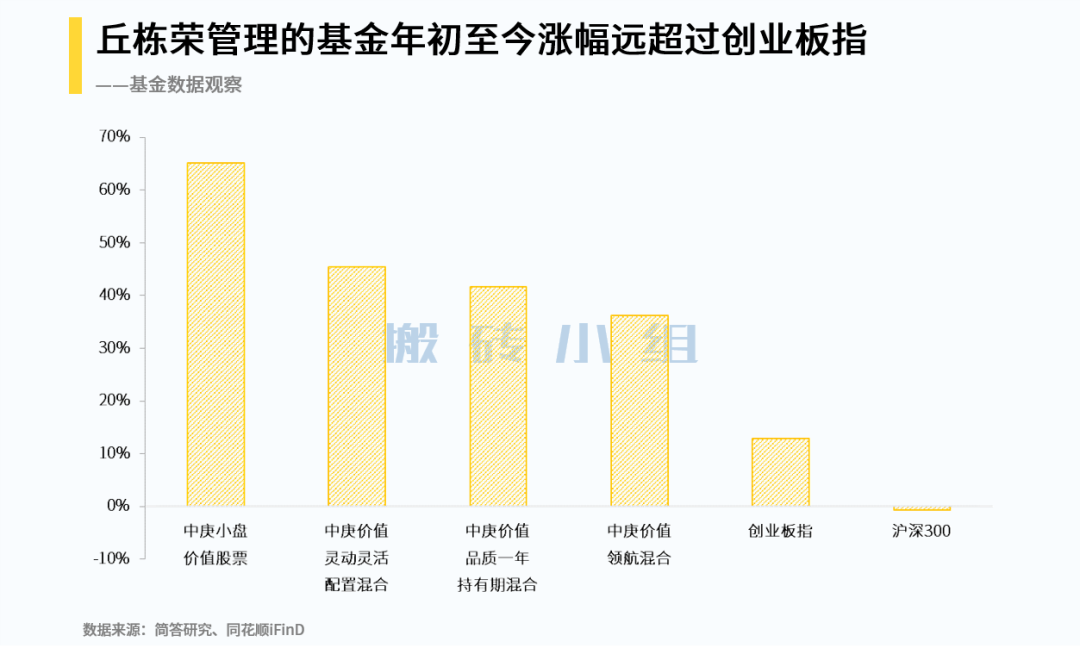 因为丘老板今年业绩非常好,管理的四个产品,年初至今都完全跑赢沪深300和创业板指,最强的中庚小盘价值,年初至今涨幅达到65%,是同期创业板指涨幅的五倍: