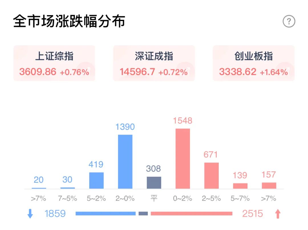 聊回市场,今天市场全天震荡上行,指数层面都收了根中阳线,上涨家数也到了2500家。涨停板80+,跌停板只有个位数,市场交易情绪明显回暖了不少。
