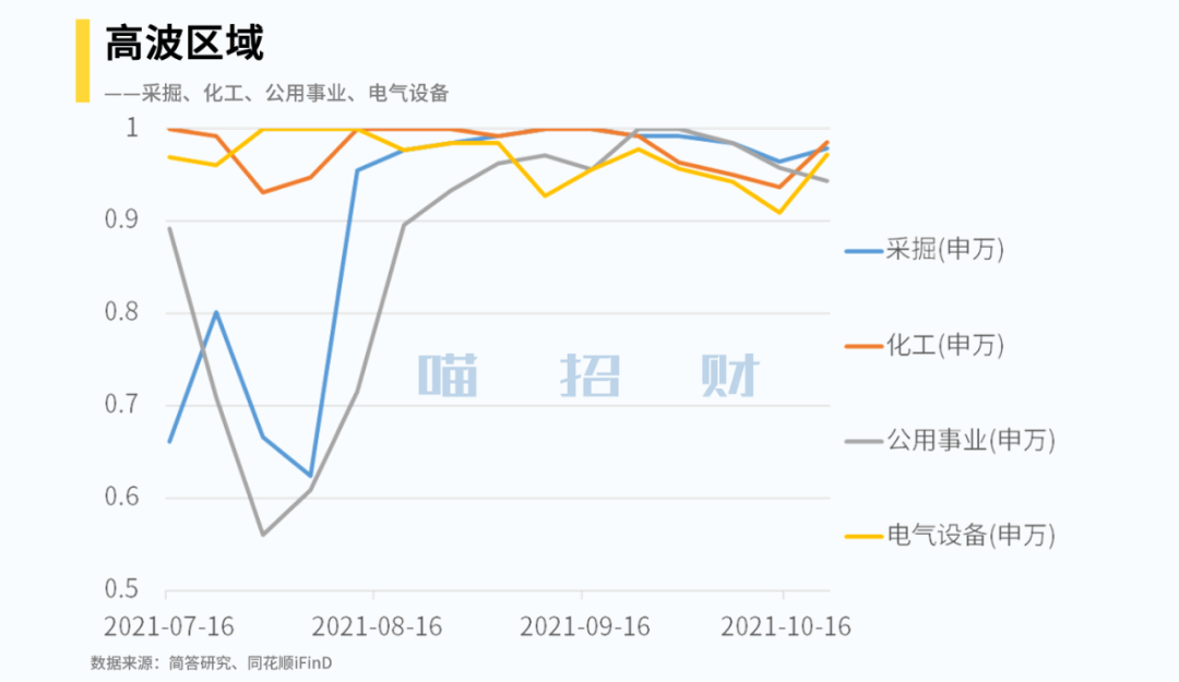 首先看高波区域,还是采掘、化工、公用事业和电气设备这四个方向,主线逻辑就是双碳的交易,这已经持续3个月了,真的是够持久的。。