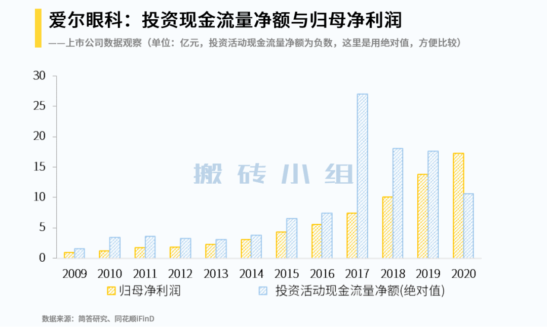 并购需要钱,爱尔眼科的投资活动现金流量净额每年都为负数,从2009年到2020年累计净流出106亿元,同期净利润合计69.4亿元。