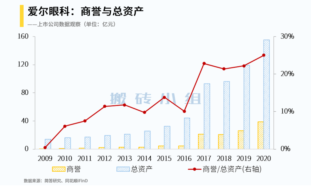现在这个模式遇到些质疑,除了前面说的资金压力、商誉越来越多,还有就是随着上市公司体量变大,并购带来的增速放缓等。不过整体上看,爱尔眼科在体外仍旧培育有大量的医院,2020年初,爱尔眼科上市公司体系内有医院170家,2020年新加入72家,到2020年底,并购基金旗下仍旧在上市公司体外培育有319家。