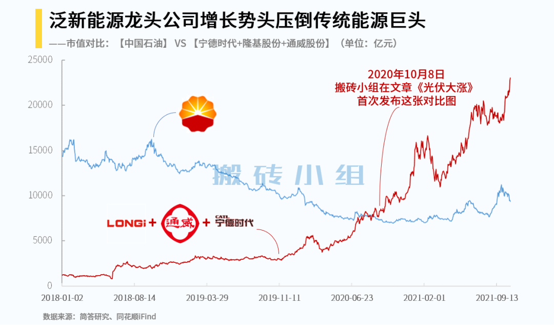 我们2020年10月8日的文章《光伏大涨》里做过一张,泛新能源龙头公司增长势头压倒传统能源巨头的对比图,现在又拿出来更新一下数据品一品,能找到些与大佬的共鸣: