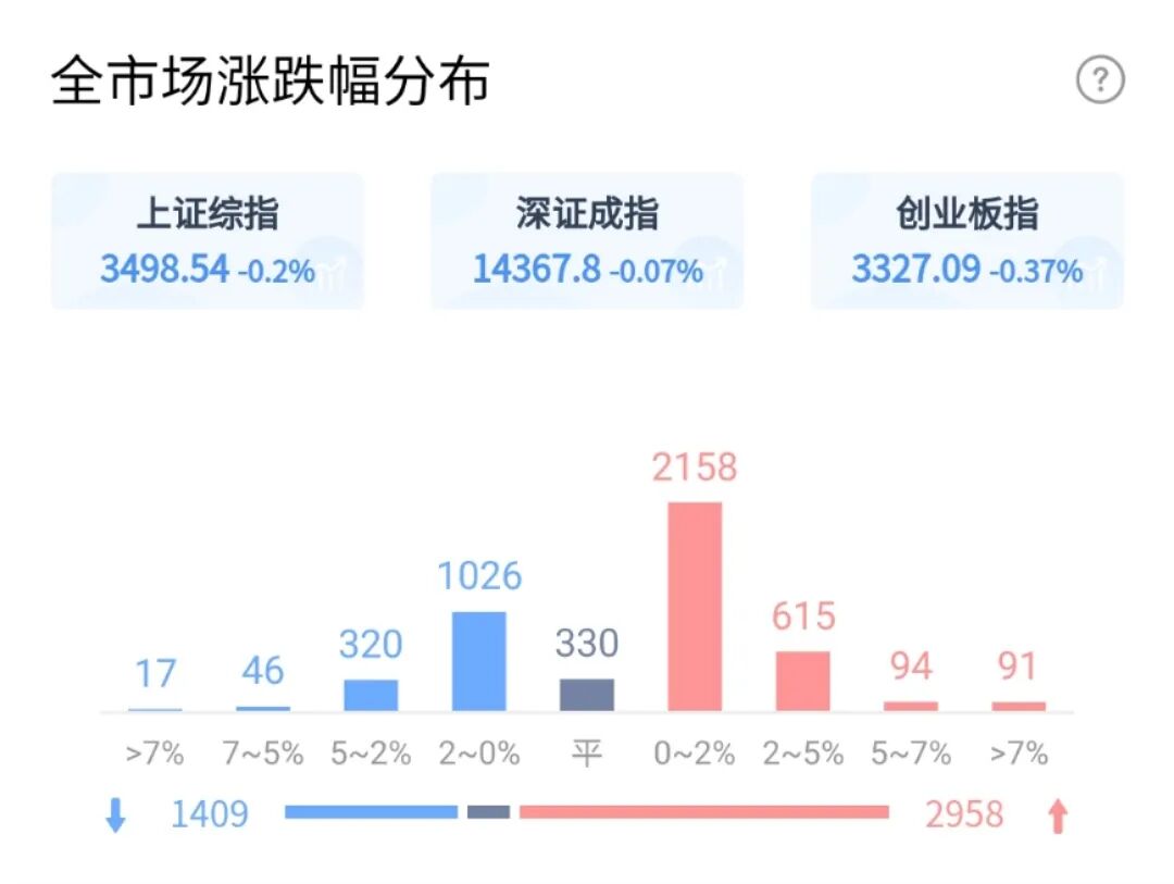 昨天市场跌幅较大,今天市场稳定了些,日内走了个小V,到收盘看依然保持在震荡区间。不过结构上看,今天有2900家公司是上涨的,这里市场逐步开始稳定了。