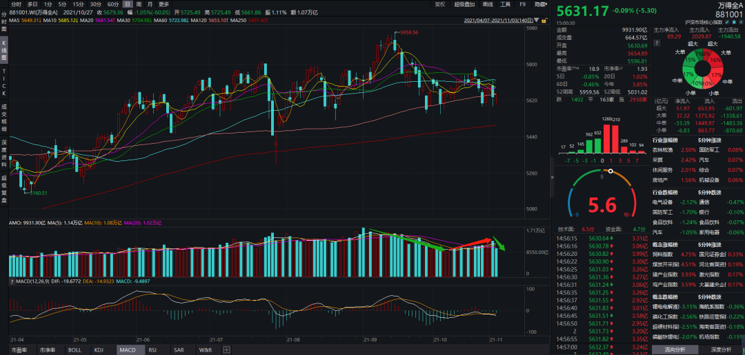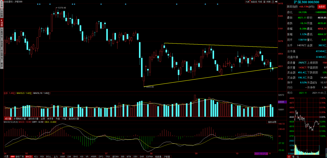 市场昨天大跌后,今天急剧缩量,日内走了个小V,按照往常的经验看,这是一个比较好的做多信号。但是从沪深300的角度看,这里正好跌破了收敛区间的下轨,这周还有美联储议息会议要开,等一等会更确定一些。