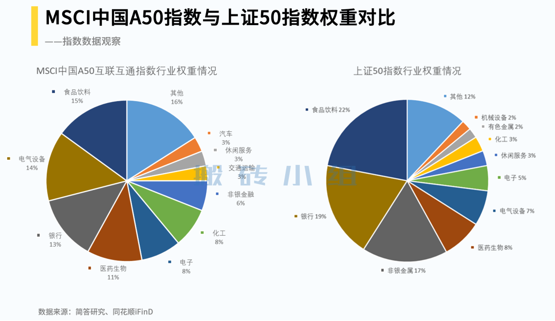 富时A50,从A股市场选择合格的最大50家公司,自由流通市值加权,季度调整,主要由金融和消费构成,上证50编制方法类似。