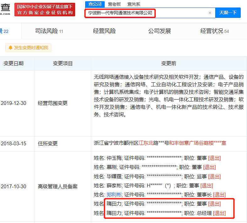 于是我们仔细研究了一下这个合同的委托方,“宁波新一代专网通信技术有限公司”,从其工商信息中找到了一个非常眼熟的人:隋田力。