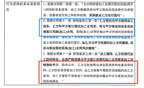 这种情况通常是和客户签的合同条款导致,于是小组找到这份合同中的相关条款。下图的红框部分清楚的确实写明了“佳华科技”无权处置相关产品。