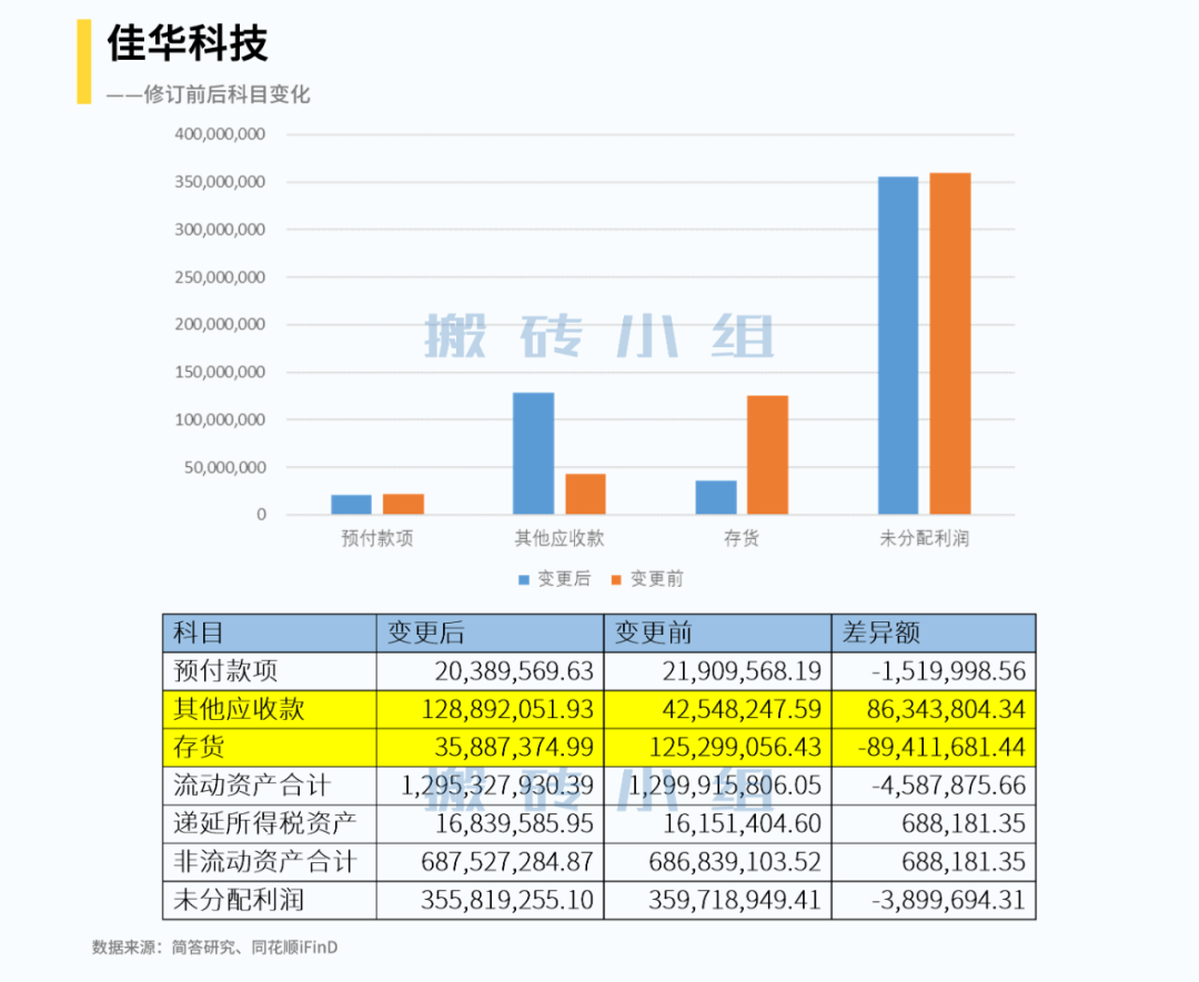 从上面的表里很容易可以发现,主要的差异变化是在其他应收款、存货、未分配利润以及预付账款,造成这种变化的主要原因是存货的差错更正。