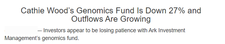 但是,她今年的业绩,放到持续大牛市的美股里面,就显得不太行了,比如她旗下的一只基金——方舟医疗保健(ARKG)年初至今大跌27%,而同期的纳斯达克生物科技指数上涨10%左右,严重跑输对应的指数。