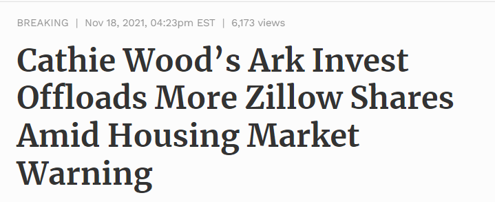木头姐的方舟创新基金在11月初还拥有价值超过6亿美元的Zillow股票,最近实在跌得受不了,选择全部出清。
