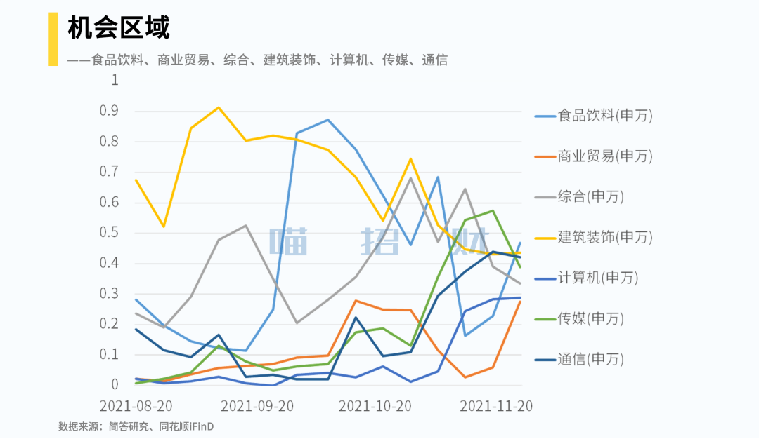 拥挤度区域上没啥特别要说的,不过这一周我做了个更新,把拥挤度在20%-50%的行业都算到了机会区域里面。在机会区域里面的行业还没有得到资金的充分认可,要在这里面进行交易,需要看更多一些基本面的资料才行。