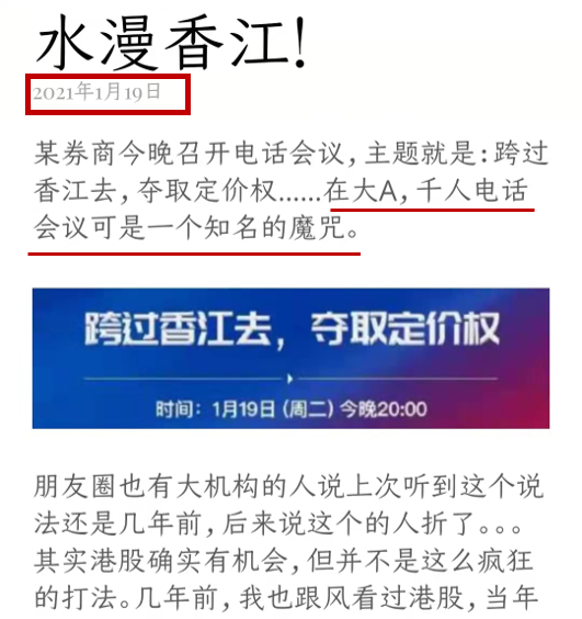 中概互联今年真是惨,年初的时候,大A很多基金经理还都在喊,“跨过香江去,夺取定价权”,当时有一个标志性事件,就是某券商举办一场千人电话会议。咱们文章里还聊过,大A的千人电话会议是一个知名魔咒!