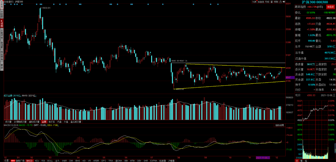 市场今天普涨中阳线,从盘后看整体还是很不错的,唯一有点遗憾的就是今天缩量了,缩量上涨保守的理解是空头较弱,并且从盘后看,沪深300刚好到震荡区间的上沿。