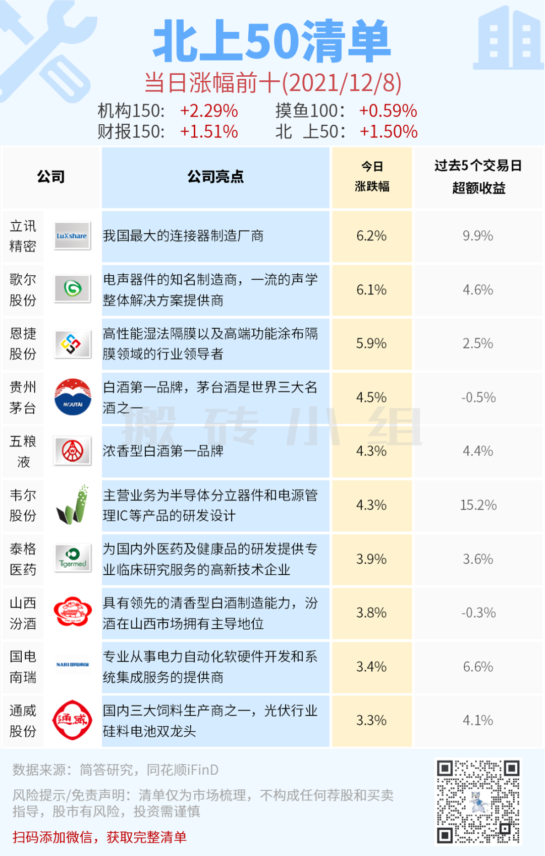 北上50榜单今天表现还不错,消费、电子、新能源都有上榜,市场呈现非常好的普涨状态。