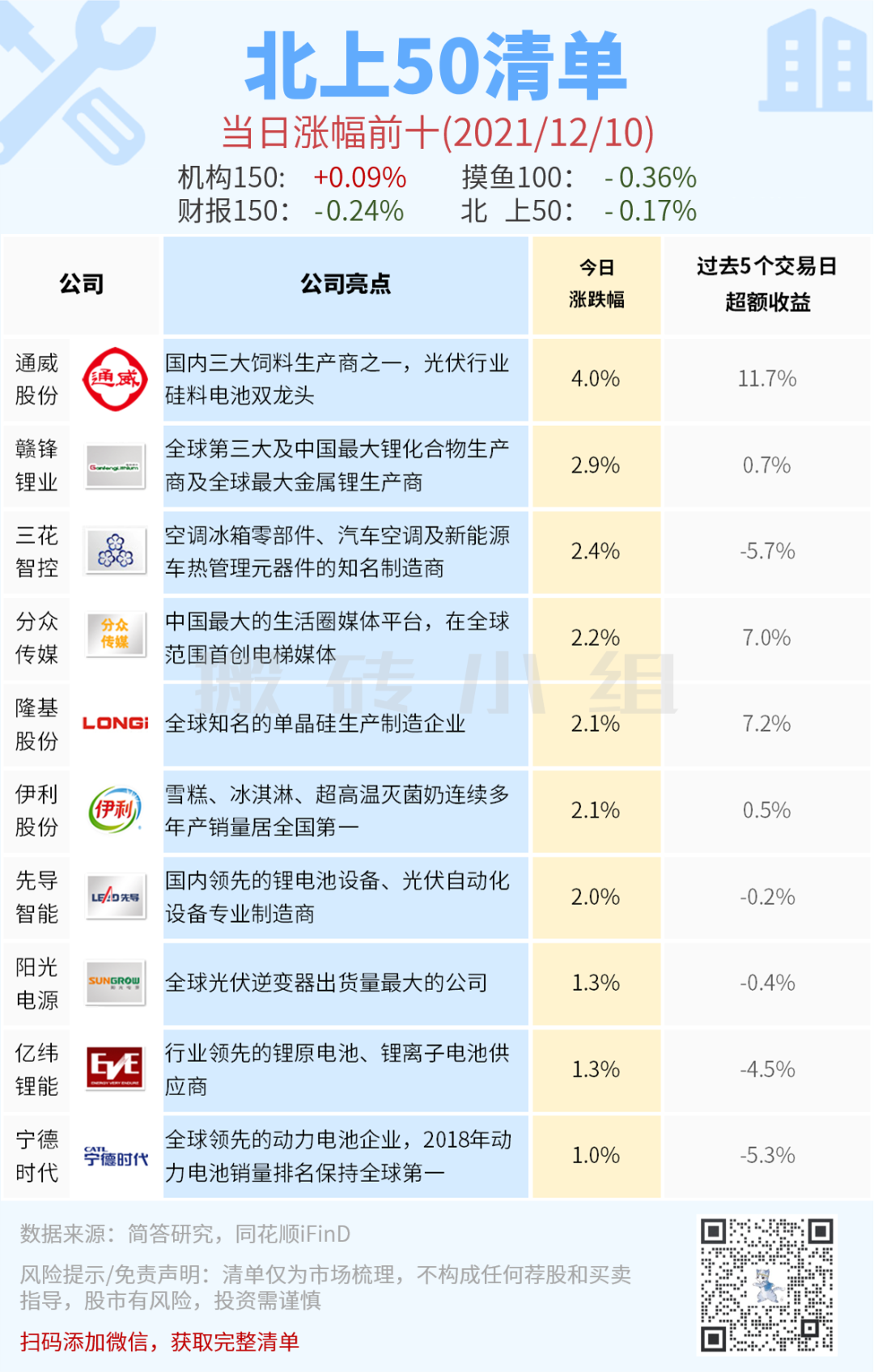 北上50榜单今天表现一般,新能源跌多了开始反弹,整体依然呈现震荡的格局。