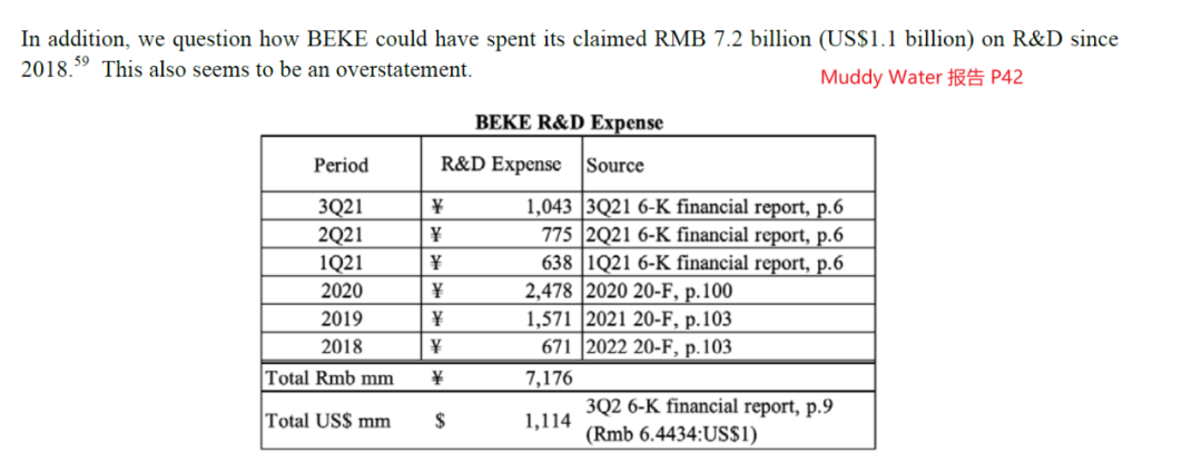 到研发费用这一块上,小组看到浑水给的“锤”都乐了。浑水质疑贝壳的研发费用有水分,给出的理由居然是数额太大了……(从2018年开始,R&D费用总计约72亿)