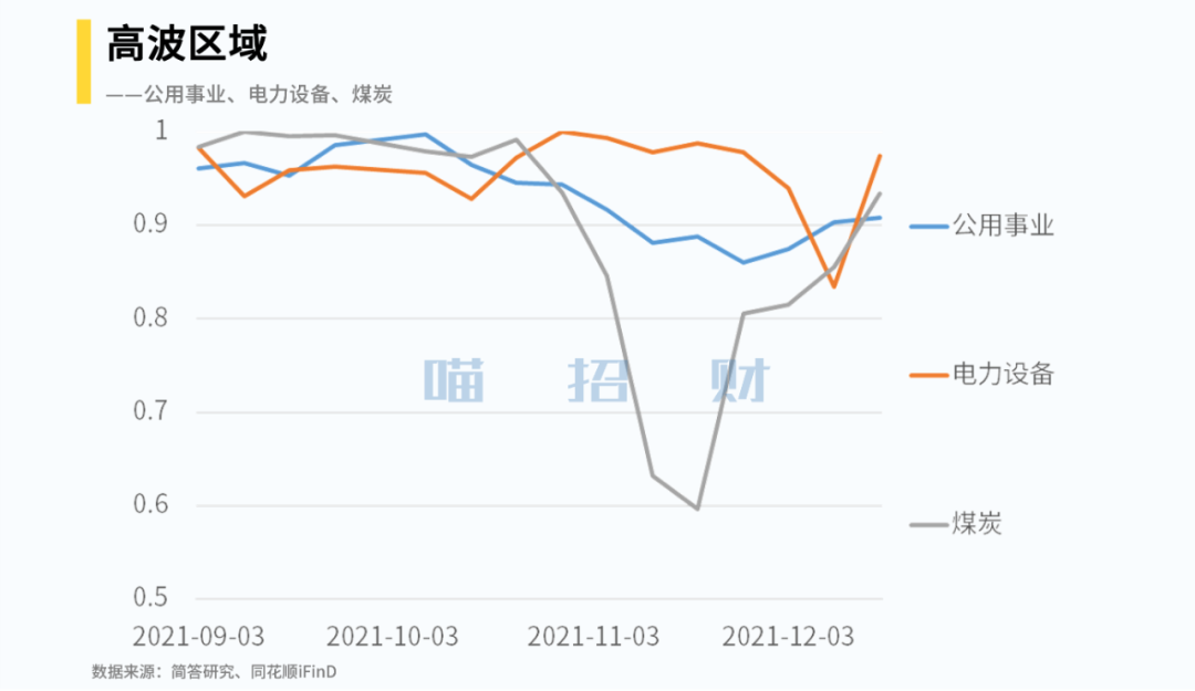 行业拥挤度上,高波区域有公用事业,电力设备和煤炭,前两个都是绿电的逻辑,煤炭上周市场讲了氢的故事。