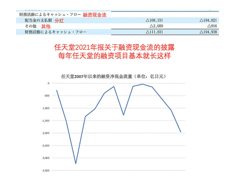 自从1983年上市以来,任天堂就贯彻“无借债经营”的原则,看它08年来的报表,有息负债一直是0,甚至融资现金流一直是负数——也就是说,回购股票和分红是它唯二的融资活动,看看下图,融资活动全是反哺股东的现金流流出,经常遭大A反复揉搓的小姐姐表示实名羡慕啊……