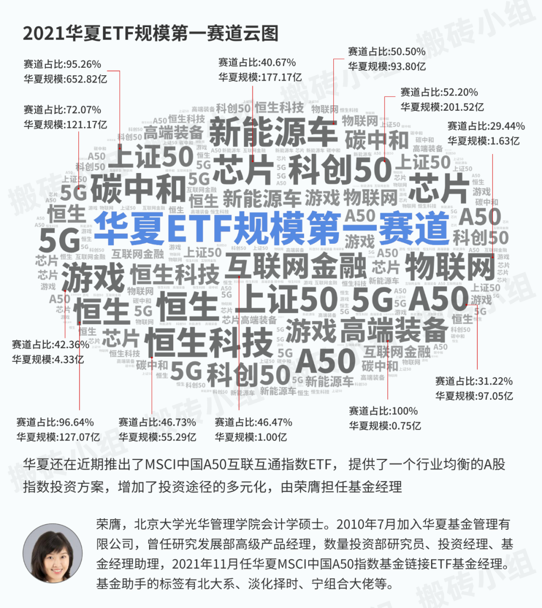 在产品的布局上,各种宽基指数、债基指数,华夏都有对应的ETF品种,规模优势也很明显。目前市场上最大的单品ETF(510050),也是华夏他们家的。另外,恒生互联网ETF、新能源车ETF、科创50ETF、A50ETF、碳中和ETF都做到了同赛道规模最大。(数据来源:盈米简答研究院、同花顺iFinD)