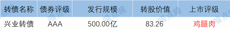 兴业转债今天就要上市了,中签的兄台有不少,简单扯两句。鉴于近期兴业的业绩靓丽,正股凸凸了一小波,直接把转股价值从申购时的70出头顶到了83,牙签肉升级为鸡腿肉。