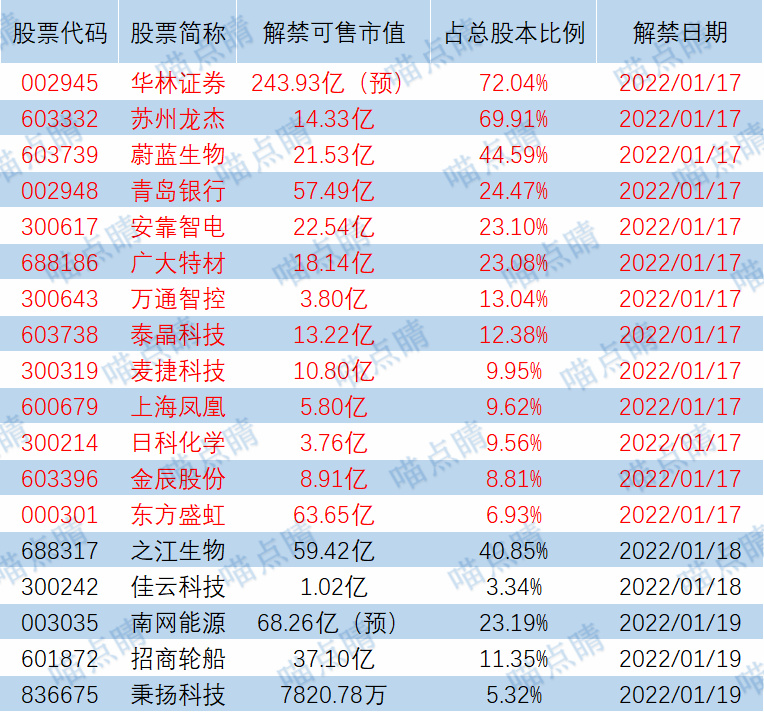 今天华林证券、苏州龙杰等有大额可售解禁。