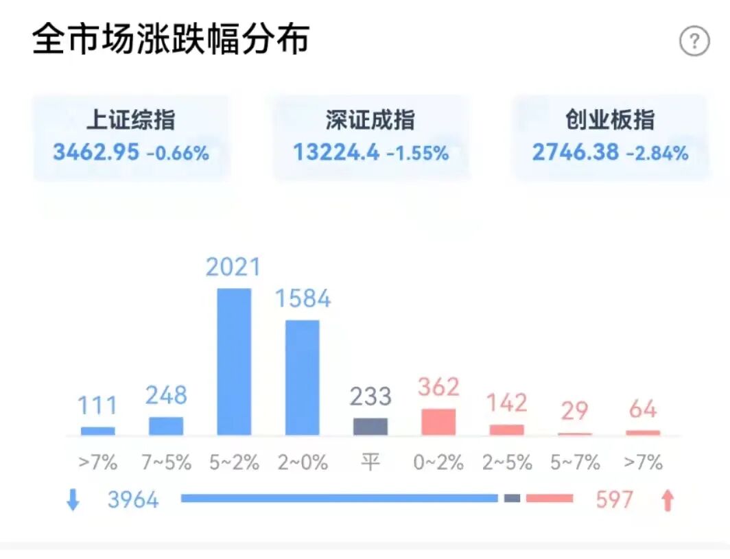 聊回市场,今天市场整体表现比较差,各大指数都收跌,创业板更是跌了2.8%。全市场接近4000家个股下跌,亏钱效应满满。。