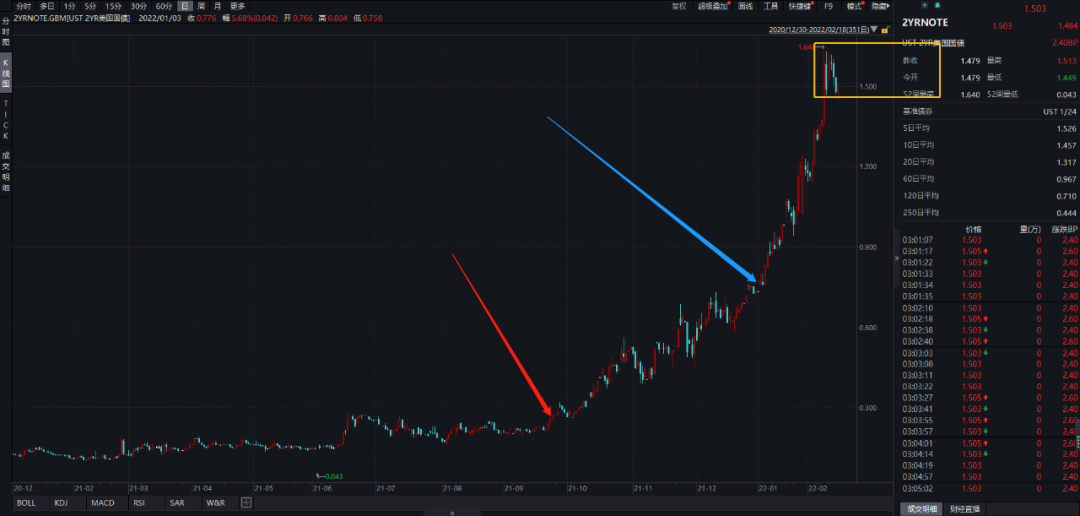 先看美国那边,这块影响比较大的是成长股。这一轮美国短端收益率的上行是从9月开始的,到12月开始走趋势,元旦(蓝色箭头)开始加速上行,直到上周五出现阴线调整加速段结束。