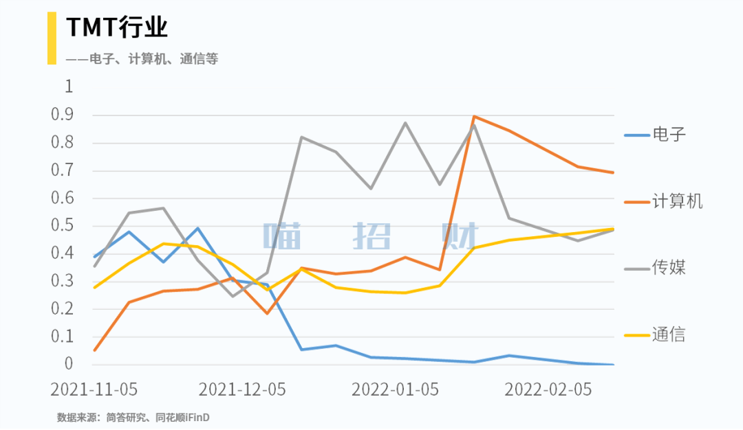 TMT板块里,电子的拥挤度被摁到了地板上,市场是一点都不关注这个板块了。不过通信和计算机的热度还是不错的,这也是东数西算消息能引发波动的基础。