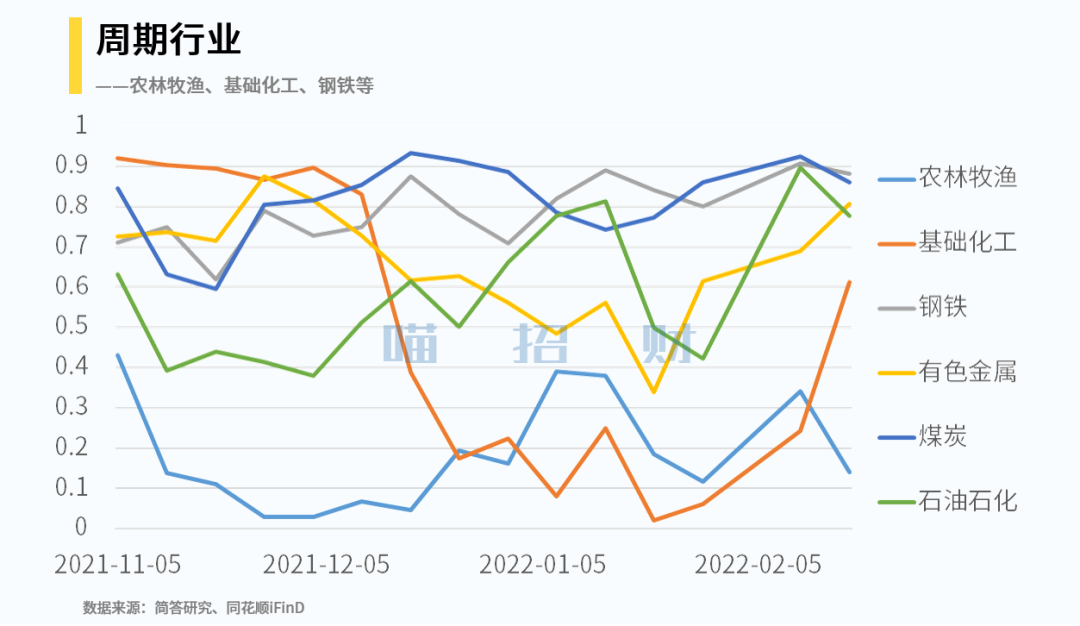 大板块这边,周期板块除了农业以外,其他的拥挤度都在50%-90%,也就是活跃区域。这说明整个大周期市场现在是比较关注的,我们也可以多看看这块的机会。