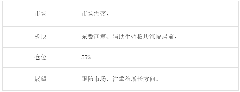 策略上没啥变化,保持仓位跟随市场,结构上重稳增长一些,不过内部也要做好节奏,比如这两天数字基建涨得比较多,就可以切一点交易仓到其他方向上。